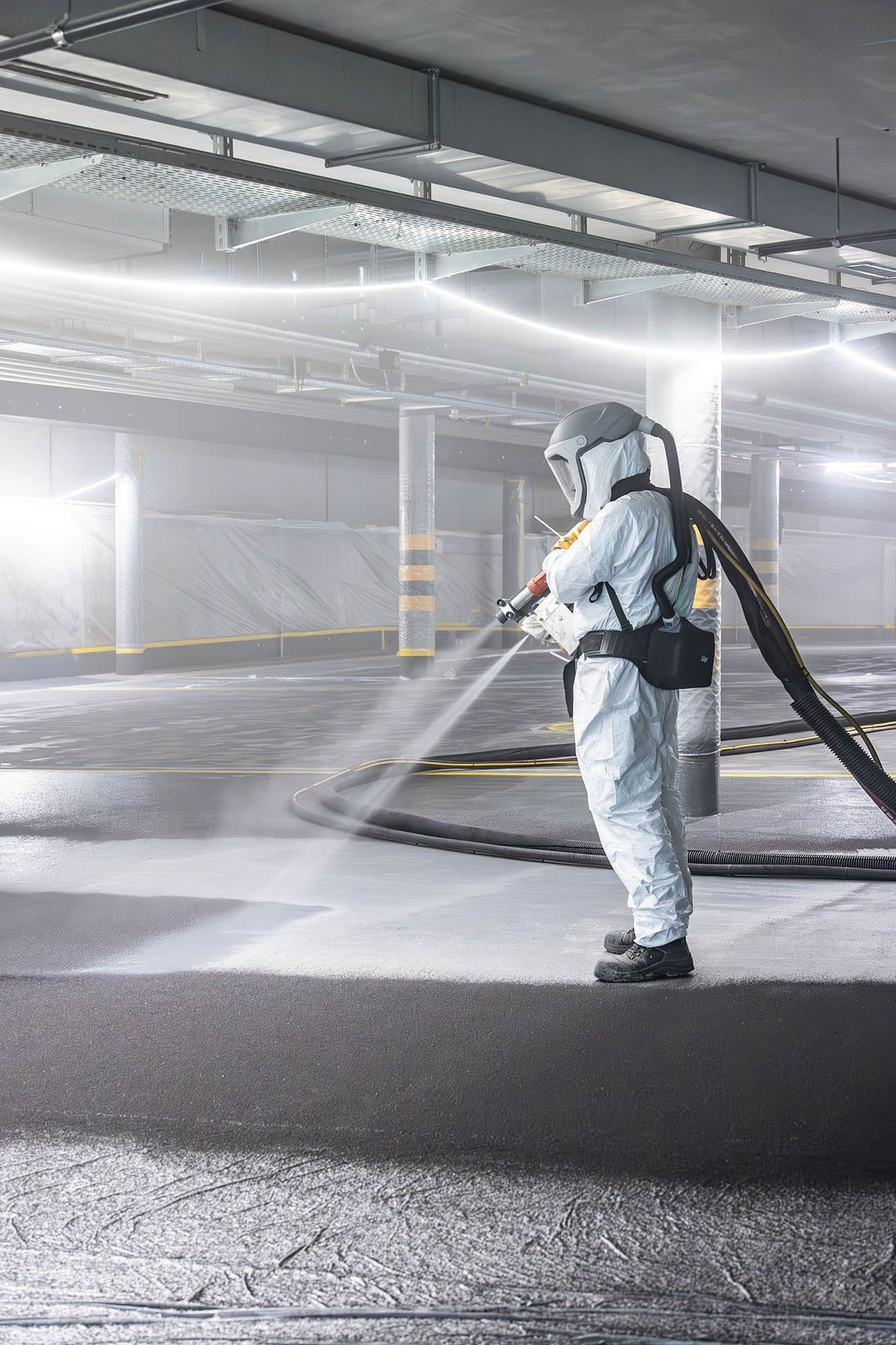 Se aplica mediante proyección a alta presión, seca en segundos y se adapta a cualquier geometría. Ofrece una excelente adherencia y alta resistencia al tránsito y agentes climática